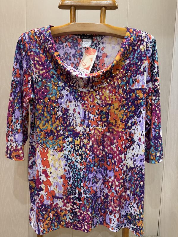 В наличии красивая кофточка фирмы KIM&Co. Размер указан L..по замерам идёт на 16. Состав: 95% полиестер и 5% эластана...ткань мягкая и приятная к телу, хорошо тянется. ПОГ-56..хорошо тянется до 70, длина-75, плечи-42, длина рукава-43, ширина по низу-58+ещё хорошо тянется.