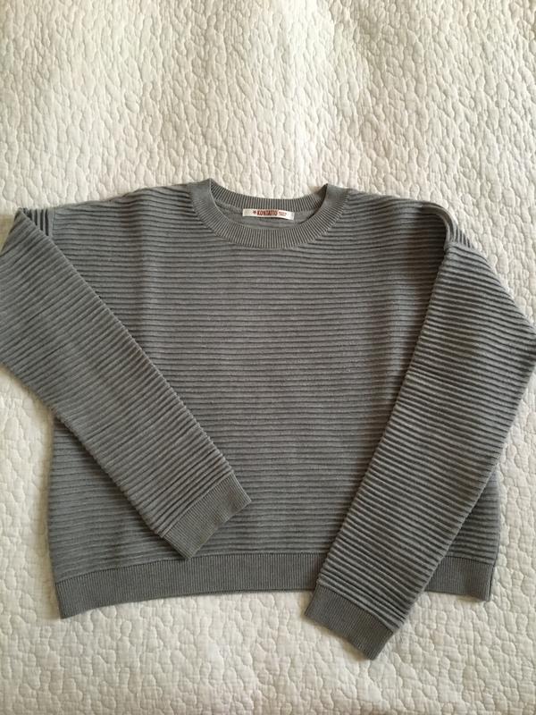 Серая ,,гофрированная ’’кофта.Классно смотрится с блузкой или футболкой,которая длиннее кофты без дефектов,не растянута!Куплена в Италии ширина кофты 51 см.подойдёт как на размер S,так и М