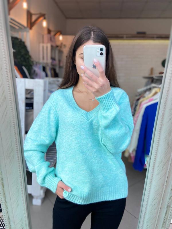 Свитер бирюзового цвета v-образный вырез. Приятный на ощупь идет по типу оверсайз.Средней длины.Будет хорошим дополнением к вашему образу.