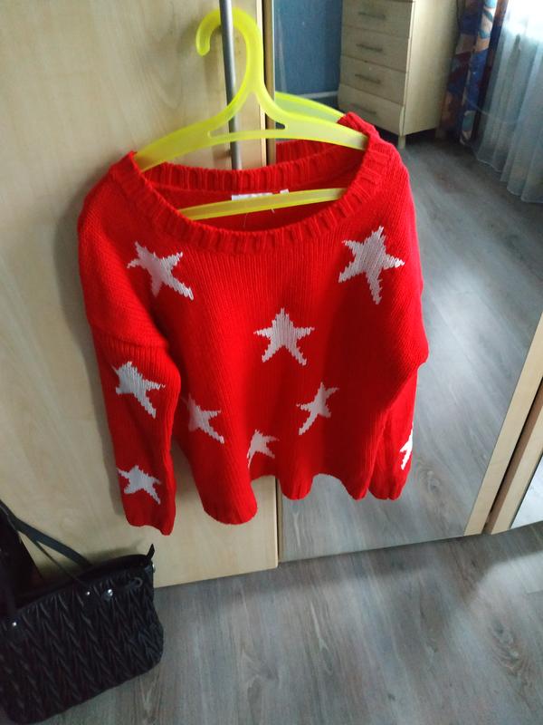 Свитер красного цвета со звездочками. Теплый. Очень красиво смотрится. Подойдет от 46 до 50 размера. Состояние хорошее.