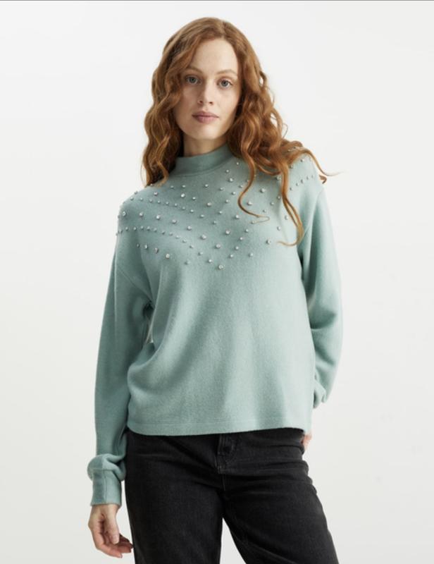невероятно мягкий и приятный свитер G&A размер L с картонной бирочкой с красивыми блестящими стразами. Свитер цвета мяты. хорош как оверсайз.