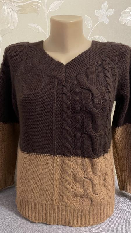 Красивый брендовый свитер в трендовых цветах шоколадном и мокко, в стиле колор-блок, теплый и мягкий