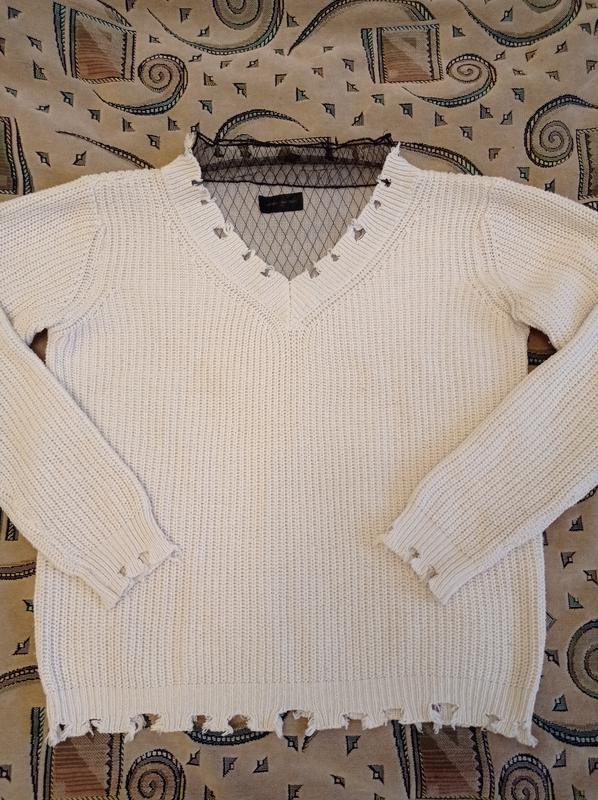 Женский свитер белого цвета с гипюровой вставкой на горловине и рваным принтом. Размер 48-50. Замеры на фото. Состав 11% шерсть, 49% полиамид, 20% полиэстер, 20% акрил. В хорошем состоянии.