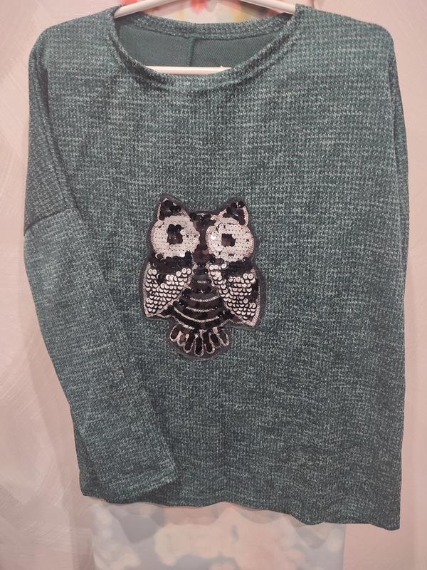 свитер с принтом совушки в маечках, легкий, приятный в тоске, спущенные плечи, ПОН-60, по низу-64, рукав-60, по бицепсу-36