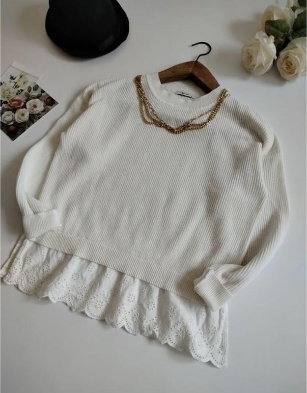 Предлагаю красивый свитерик от бренда Tu Размер по набору:14-16/44/L(подойдет на M) Цвет:белый (под молоко) Материал:котон+акрил Тягается! Не просвечивает, мягкий, приятный на ощупь Состояние: идеальный НОГ-60 см НОТ-57 см Рукав-61 см Длина -67 см