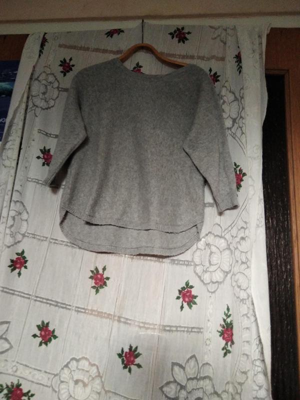Хорошая кофта серого цвета-фирменная,теплая, пушистная, лёгкий, вырез, низ рукавов, низ кофты-манжет-резинка, длина рукава от шеи-46см., длина спереди-48см.,зади-57см.,объем в груди-108см.