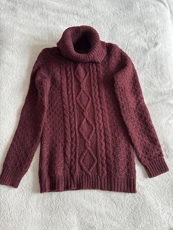 Красивый свитерик, теплый, с высокой горловиной. В составе есть шерсть, но бирка со составом срезана, поэтому процент не знаю. Цвет насыщенный бургунди, максимально точный передан на последнем фото, остальные фото засветлены. Замеры в не растянутом состоянии Ширина 41 см Длина 62 см Плечи 35 см Рукав 65 см
