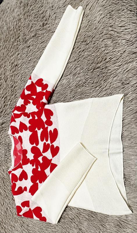 Женский свитер на размер S/M Машинной вставки, производитель Турция Состав вискоза/ шерсть/акрил Молочного цвета с отделкой рисунка, в виде сердец красного цвета Очень стильный и романтичный ❤️