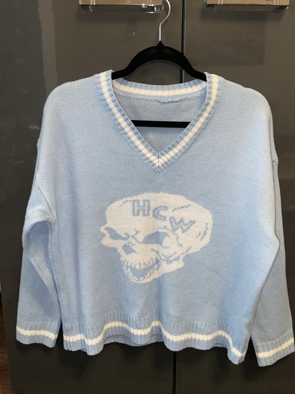 Блакитний шерстяний светр з принтом милого черепа💕 Розмір S-M В ідеальному стані, одягала декілька разів, дефектів немає