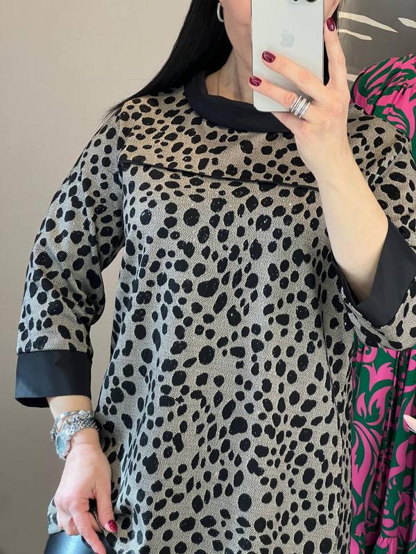 невероятно красивая и удобная туника свободного кроя с рукавами чуть ниже локтя и эффектным воротником из плащевки отлично будет смотреться на девушках с разными типами фигур туника изготовлена из приятного к телу коттона с эластаном с необычайно красивым принтом, украшенным эффектными блестками размеры 50 52 54 56 58 60 в зависимости от размера длина 74-78 см, объем груди по изделию 110-134 см, длина рукава от шеи 55-59 см код S 138