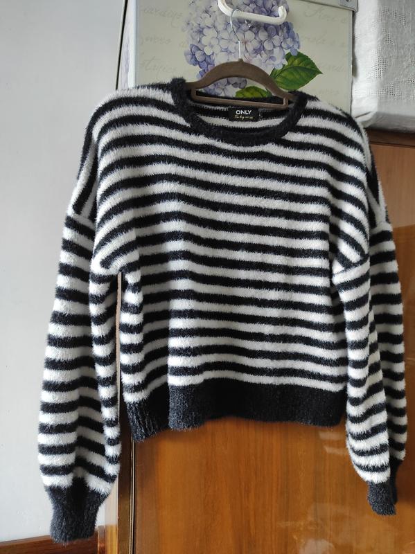 Пушистый свитер - тельняшка в ч/б полоску ONLY размер L - длина 51 см, плечи 44 см . по груди 56 по низу 48 см длина рукава от шва 48 см плечи спущены , рукав свободный и зауженные манжеты .