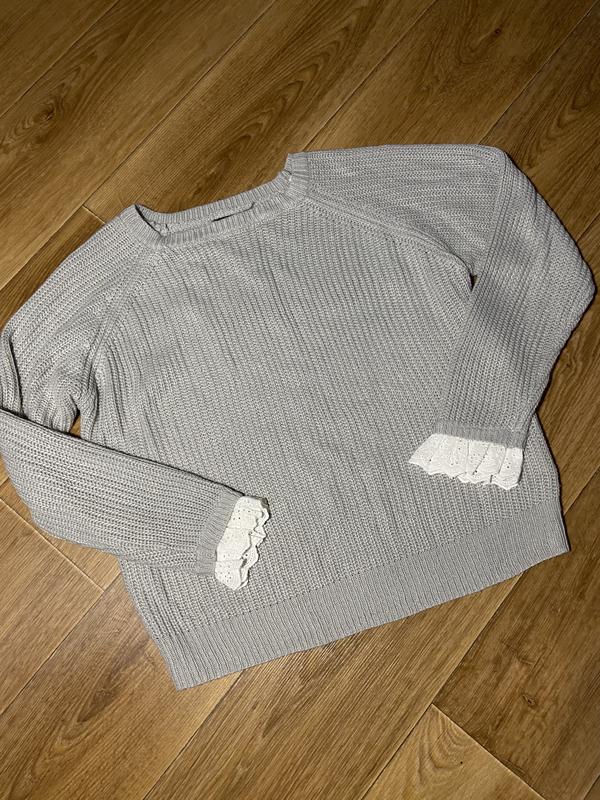 Женский свитер серого цвета с рукавами рюшами, размер S