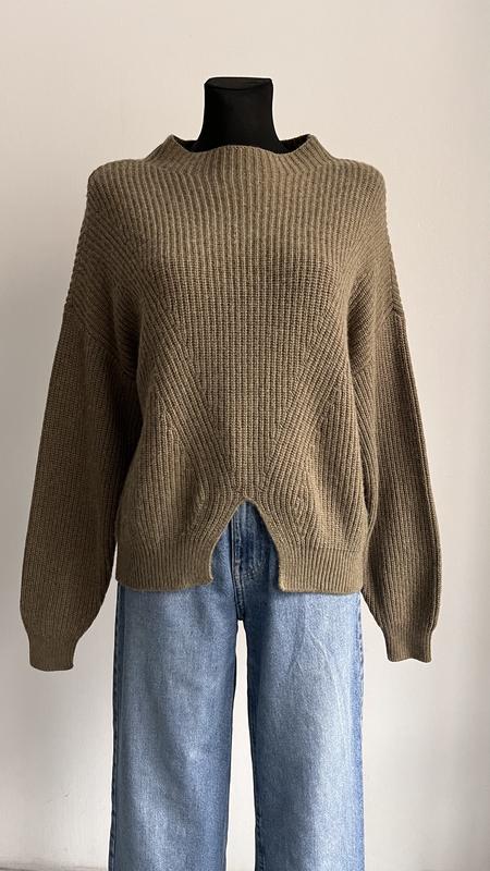 Свитер цвета хаки 40% шерсть, 40% вискоза, 20% полиамид Стан - идеальный Размер С Полуобхват груди - 55 см Длина рукава от горловины - 76 см Длина -58 см