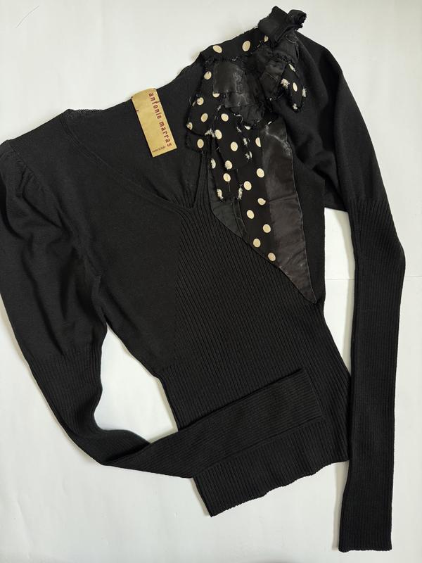Кофточка из тонесенькой шерсти Antonio Marras с красивым шелковым украшением на плече в виде банта. Длинный рукав, есть подплечники. Размер 42 итальянский Замеры: Длина - 57 см Полуобъем груди - 38 (тянется до 46) Длина рукава от плеча - 76 см