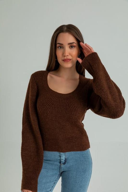 Светр з круглим вирізом по фігурі Склад: 100% акрил Стан ідеальний (надягався 1 раз) Плечі - 40 см Напівобхват груди - 40 см Напівобхват талія - 40 см Висота 54 см Рукав 64 см по довгій стороні і 48 по короткій
