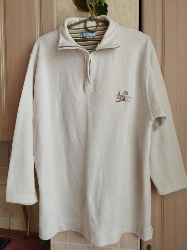 В идеальном состоянии кофта,размер 52-54, состав хлопка наполовину с полиэстером.Колир молоко. ОГ 130, длина 70,рукав 60.Сбоку разрезы.