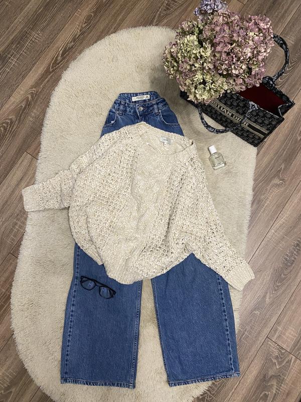 Базовый свитер свободного кроя размер XL, можно L, состав акрил, нейлон и 19%шерсти, не плотной вязки, длина 59см., полуобхват груди 61см., низ 59см., длина рукава от горловины 66см. В хорошем состоянии без дефектов.