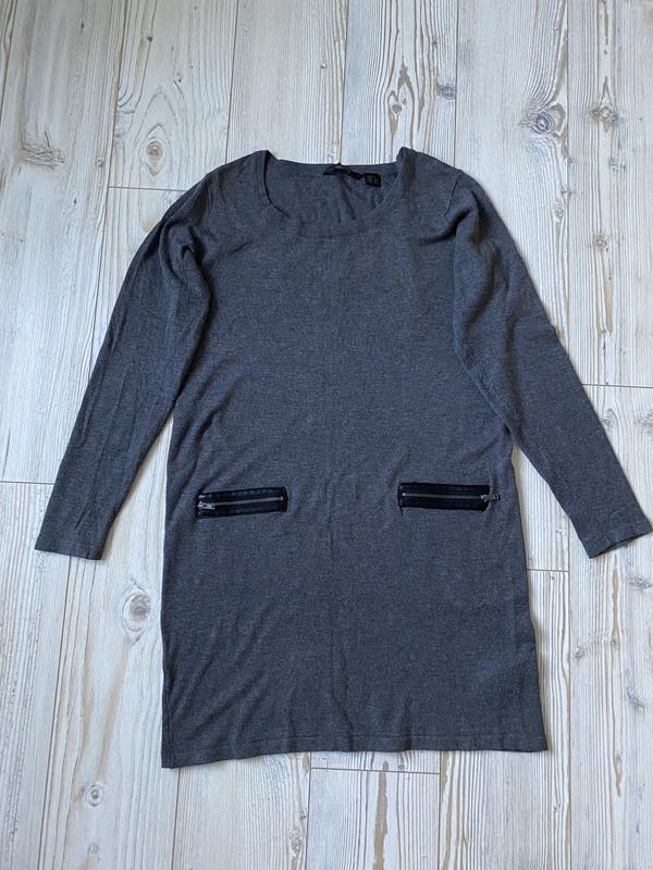 Сіра довга туніка вільного крою в ідеальному стані . Спереду кишеньки імітація , з вставками з штучної шкіри . Розмір L . Тканина приємна до тіла . Заміри на останньому фото .