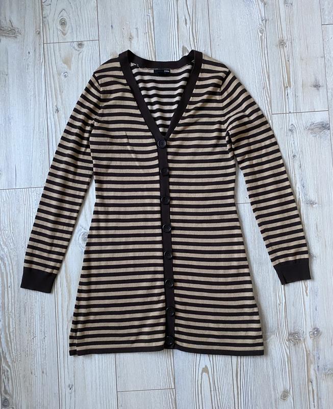 Жіночий подовжений кардиган в полоску шоколадного і бежевого кольору . В ідеальному стані . На гудзиках . Розмір M, L . Заміри на останньому фото .