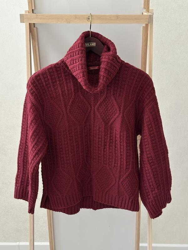 Женский свитер гранатового оттенка. Теплый, отличный для зимы. Немного укороченный, крой прямой. Состояние отличное, без пятен или зацепок. Высокое горло красиво закрывает от ветра, можно вложить как угодно. Тканина приємна, светр не парить
