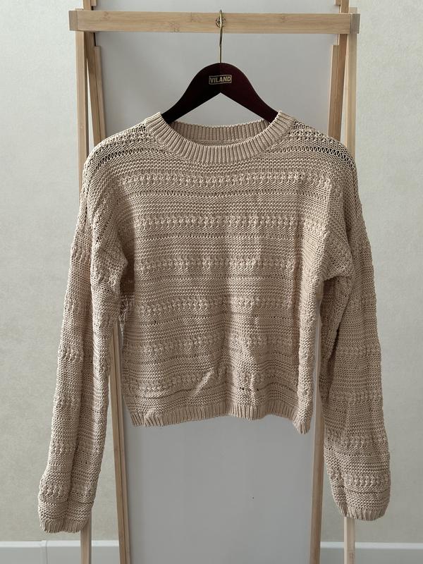 Женский укороченный свитер. Бежевого цвета, может немного просвечиваться на узорах. Ткань очень приятная к телу, выглядит женственно на теле. Можно спустить на одном плече) Свитер не короткий, но немного укороченный по сравнению со стандартной длиной. Стан идеален, без пятен или повреждений.