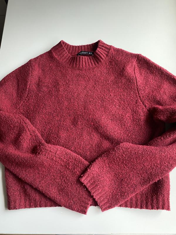 Укророчений светр Stradivarius у розмірі s (26). Колір: бордовий (трішки темніший ніж на фото). Склад тканини: 86% поліестер, 6% акрил, 4% шерсть, 4% еластан. Довжина по спині: 45 см. Светр дуже теплий, але не парить, тканина тягнеться.
