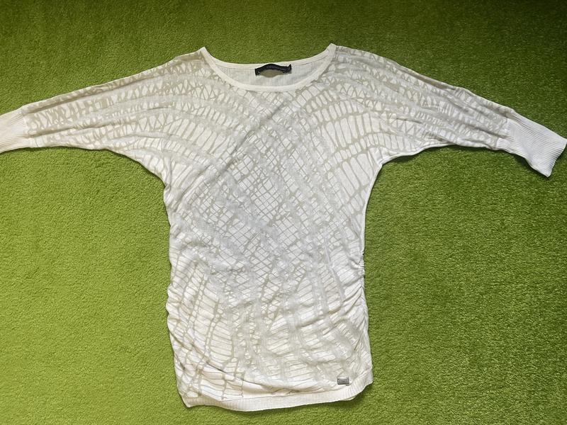 Дуже легенька, прозора кофтинка. Є на спині маленька дірочка. У вартості враховано