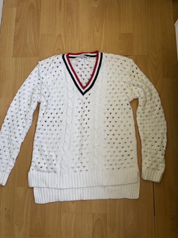 Легкий женский свитерик в дырочку,позади слегка удлиненный.Одевался один раз. Подходит как на ХС так в С