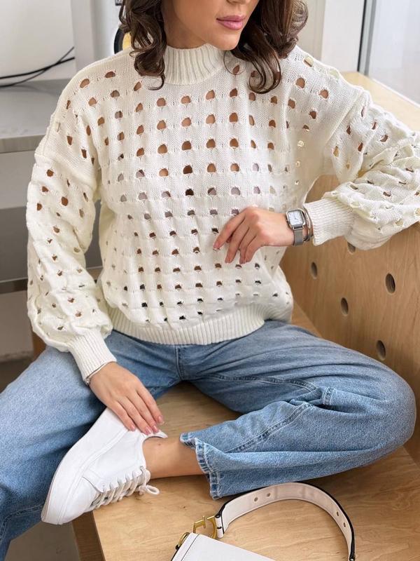 Светр Модель: 290 Размер: универсальный Ткань: машинная вязка (производитель Турция) Цвета: белый, черный, малиновый Замеры по изделию: Объем груди - 110-130 см Длина по спинке - 54 см Длина рукава от плеча - 50 см Этот стильный вязаный свитер с необычной перфорированной текстурой придаст вашему образу яркости и оригинальности. Высокий воротник обеспечивает дополнительный комфорт и тепло, а модный дизайн делает свитер идеальным для создания современных и смелых луков. Носите его с джинсами, юбками или классическими брюками - он всегда смотрится эффектно!