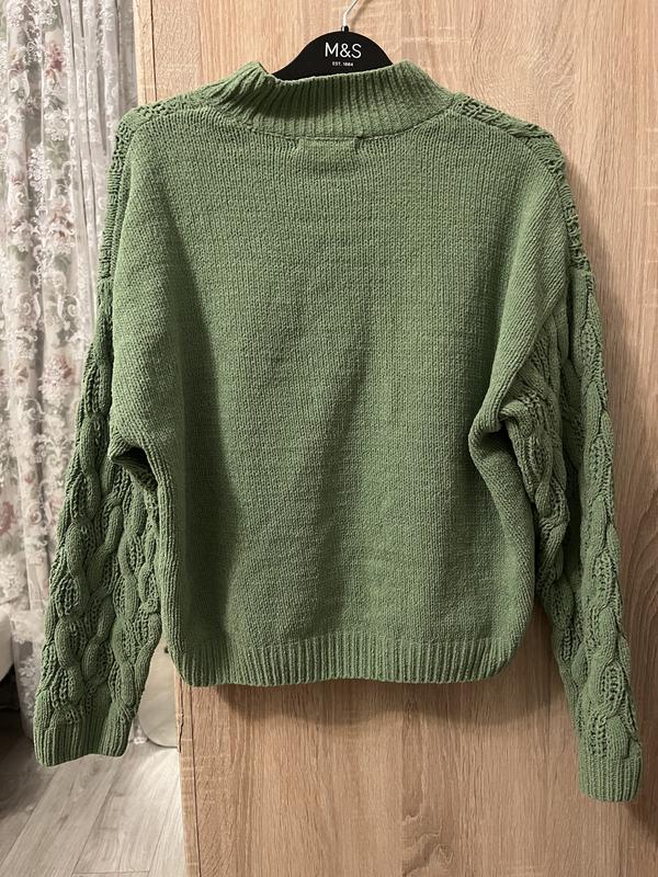 Цвет- молодого гороха, мягкий)))). Спокойно можно и на Ог 53( на себя спокойно одеваю). Спереди немного короче. Длина изделия 50 см.