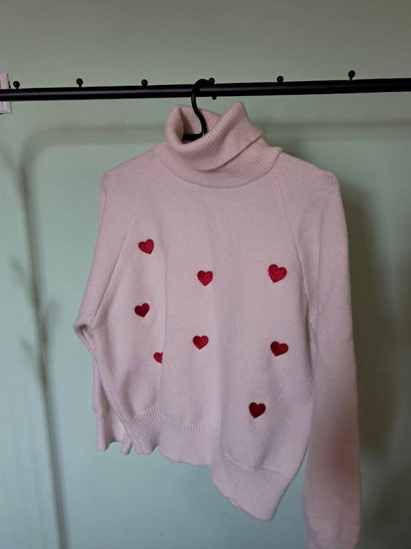Білий светр з сердечками та горловиною