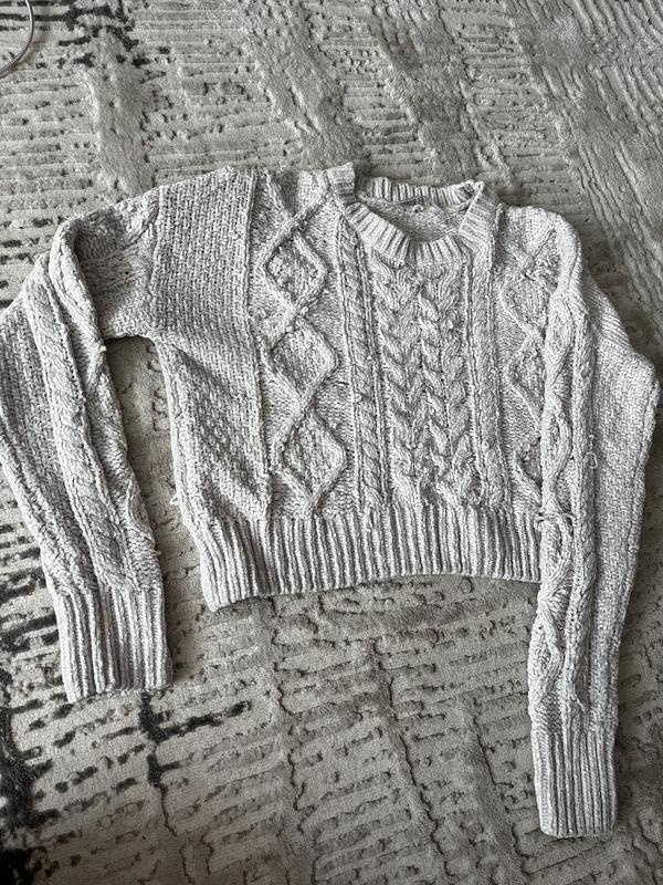 Красивая теплая кофта, укороченного типа, красивого серого цвета красивой вязки с вытянутыми нитями.