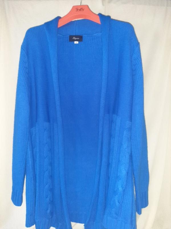 Ткмно- синій кардіган, без застібок, стан ідеальний, розмір UK 14: ПОГ - 57см, рукав - 66см, плечі - 43см, довжина - 82см по спинці - 82см та перед - 93см клинці. По складу - 100% акріл