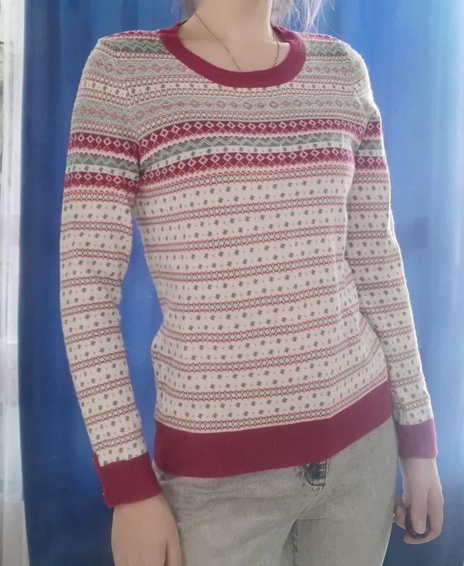 Красивый нежный свитерик, не колючий. Размер по стандарту хс, с. Имеет красивый рождественский узор. Дуже хороший бренд. Стан идеален, без катышек.