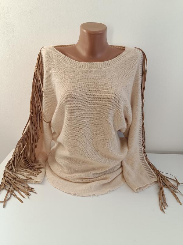 Кашемировый свитер от люксового бренда Zadig & Voltaire. Обработка кожаной бахромой. Размер М/ L. Цена на сайте 29097. Стан идеален. 🖍️ПОГ-54 🖍️ПОТ-45 🖍️ ДОВЖИНА -73 🖍️РУКАВ -56 от горловины