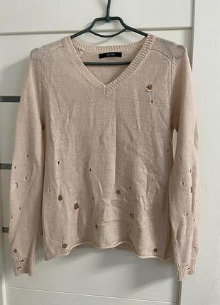 Стильный свитер с равностями, очень хорошего состояния, на размер С-М. Розово-персикового цвета, легкая, тонкая вязкая..
