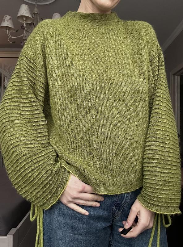 Теплый и приятный на ощупь свитер, в котором рукава могут иметь разную форму - затягивая или разпуская шнурки. Также связан с блестящей нитью, поэтому имеет легкий блик.