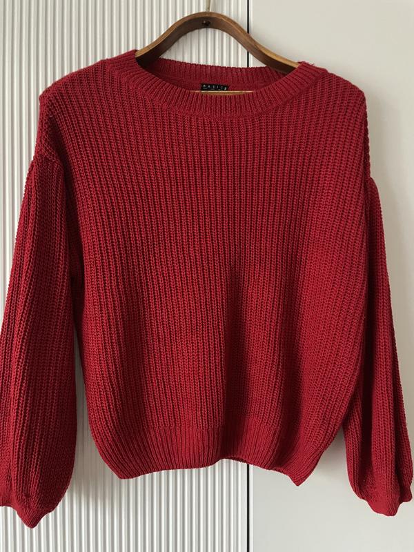 Светрик, який дарує настрій! Насичений червоний колір, м’яка в’язка, не кусається. Стиль oversize, гарно сидить на розмір M-L. Мінімалізм, який легко поєднується з будь-чим. Рукав повний, спущене плече, приємний до тіла. Носився кілька разів — стан відмінний, без плям і кошлатання. Пишіть, якщо хочете заміри або додаткові фото!