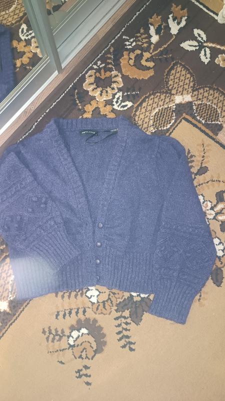 Теплый и вязаный свитер короткий, фиолетового цвета с красивым рисунком, с длинным рукавом, выполненный из трикотажа. Ткань вискоза с полиестером. Очень теплая, пуговицы вязанные, состояние идеально.