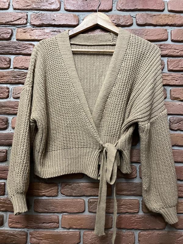 Вязаная кофта цвета беж свободного кроя на запах на завязках