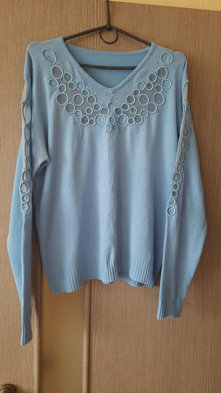 Тонкий свитер с красивым кружевным узором на рукавах и груди, с мелким декором и стразами. Свитер с длинными рукавами с манжетами, с круглым закрытым вырезом горловины. Эластичный и приятный к телу материал и качественный фабричный пошив. Стильный и удобный свитерик для повседневной носки на прохладное время года. Замеры: пог 53+ пос 50-60 длина 60 длина рукава 62, бицепс 20 см #4