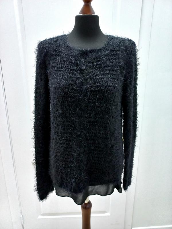 Женский пушистый свитер черного цвета на легкой подкладке, которая выходит наружу-чем добавляет вещи изюминку. полуобхват грудей 53 см полуобхват низу 53 см длина самого свитера 58см,разом с подкладкой 67см.