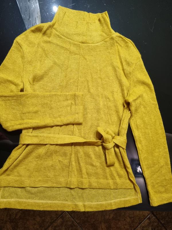 кофтинка новая в горчичном цвете с горлом под пояс (по желанию) идет с пояском, размер М. Замеры : Длина сзади 65 см. перед длина 57 см. Полуобхват по коме по изделию 49 см и легко тянется до 63 см.