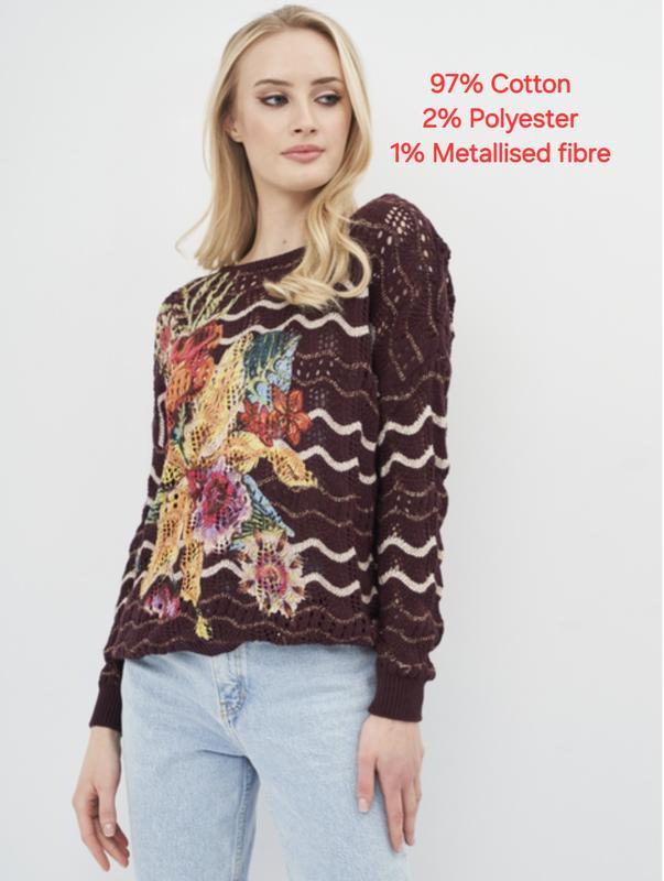 Испанская марка Desigual — это оригинальная одежда, характерными чертами которой являются узоры и орнаменты, коллажи, ручные вышивки и даже акварельная роспись. Разработана для всех тех, кто любит индивидуальный стиль, кому нравится получать удовольствие от своей одежды и быть оригинальным. Шикарный хлопковый вязаный свитер бордового цвета в цветочный узор Desigual. Свободный крой. Линия плечей занижена. Вырез лодочка. Роскошный красочный женский свитер, идеально отвечающая требованиям современной моды. Этот свитер прекрасно дополнит вашу оригинальность и непринужденную элегантность. Размер указан S (лучше ориентироваться по замерам) Рукав от ворота 73 см ПОГ 58 см Длина 67 см Состав: 97% Cotton 2% Polyester 1% Metallised Fibre Доставка: рада приветствовать вас в магазине 🐼белый умка🐼👚👙🧣🧤🧥🧦👔👕👗🥼👜🥿👟👢👠🥾🛍🛍🛍 Подписывайтесь на обновления 👀👀👀👁👁👋 постоянным клиентам скидочки 🍓🍬%%%