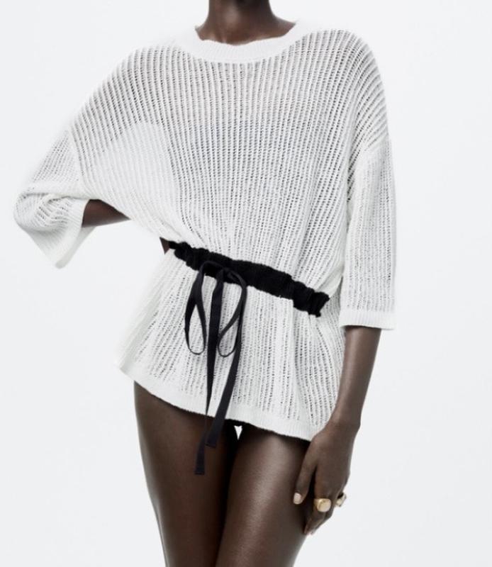 Кофта три чверті рукава. Машинна в’язка зі шнурком спереду. Довжина 60, довжина рукава від шиї -48 см, ПОГ -60