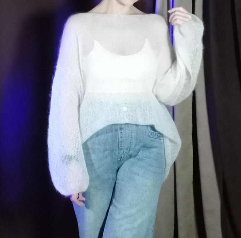 Продам свитер-паутинку из итальянского кидмохера, ручная работа. Невероятно тоненькая, совсем не кусается, цвет слоновая кость, выглядит невероятно нежно. Подойдет на размер от S до L. Длина - 64 см, ширина - 59 см, длина рукава от горловины - 72 см. Для сравнения: модель 42 размера (рост 156 см), манекен 44 размера.