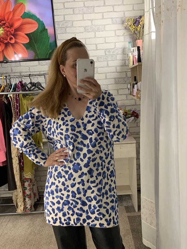 Стильний джемпер, стан нової речі! Рідкісний тваринний принт з синьому кольорі, дуже гарне поєднання з кроєм і фактурою тканини! 72% віскози і нейлон Розмір XL Плечі 40, по грудях 53, стегна 53, рукав 62, довжина 77 см
