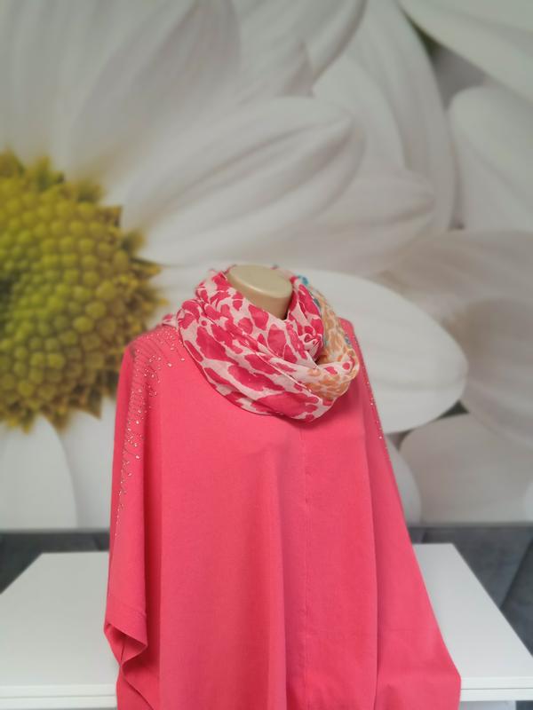 Стильная однотонная кофточка с коротким рукавом насыщено розового цвета. Легкая и комфортная. Приятная на ощупь. Гладкая машинная вязка. Нить средней толщины. Тянется с легкостью. Ложится свободно -оверсайз. Красиво спадает. По плечам украшена декоративными камушками. Аккуратный вырез Красиво смотрится с шарфом в тон в комплекте (шарф может быть заменен, но в цвете). Размер универсальный.