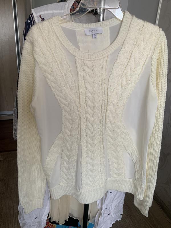 JAYE.E. Стильний светр замовлявся в США. Круте поєднання шифону та крупної вʼязки. Розкішна якість та стан. Мірки за запитом. Ідеально підійде на розмір до 48р. Розгляну ваші пропозиції?!?$ Додаткова інформація за запитом заздалегідь! Продаж без повернення та негативу! Оплата на карту. Відправлення 📦 новою та Укрпошта. Приємного вам шопінгу.)