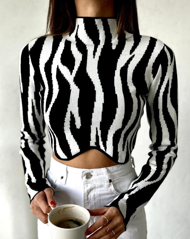 Дуже красивий вкорочений светр із високою горловиною та фігурним низом , принт зебра . Підійде на розмір М ( невеличку Л )